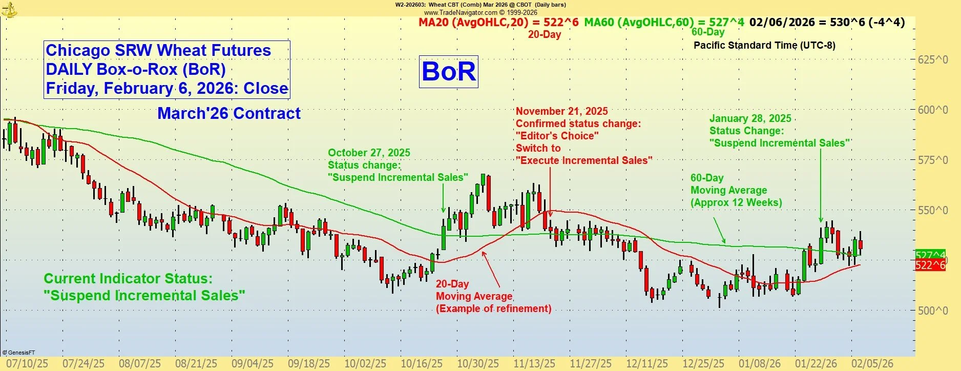 Alert: Market Bullets® Monday, January 26, 2025: Close: The Chicago March contract reached closed at the 60-day line (green), which has not been penetrated. No change in Status from “Execute Incremental Sales on Schedule”. The use of this crude indicator is not intended to be considered in isolation, or as a systematic order generator. It is for support of marketing decisions taken in a more comprehensive approach, including consulting with your merchant.